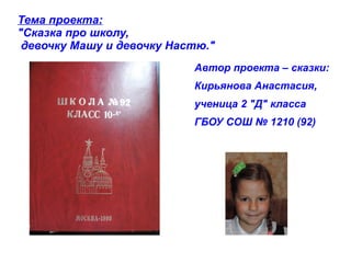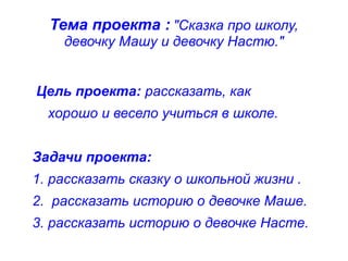 Документ представляет собой проект сказки о школьной жизни двух девочек, Маше и Насте, с целью показать, как весело учиться в школе. В сказке описывается, как Маша наслаждалась своей школьной жизнью и как она привела свою дочь Настю в ту же школу, где та также проявила активность и интерес. Гипотеза проекта утверждает, что если родители любят школу и процесс обучения, то это чувство передается их детям.