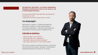 Семинар Константина Холстинина под названием «Гудвилл. Стратегия построения карьеры» направлен на изучение инструментов успешного карьерного роста в условиях современных экономических изменений. Участники семинара получат знания о том, как выделиться на высококонкурентном рынке труда, повысить свою капитализацию и эффективно составить резюме. Мероприятие включает интерактивный формат и примеры из практического опыта спикера.