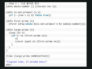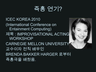 즉흥연기와프로그래밍 1. 2. 즉흥 연기?ICEC KOREA 2010(International Conference on Entainment Computing)제목 : IMPROVISATIONAL ACTING WORKSHOPCARNEGIE MELLON UNIVERSITY교수이자 전직 배우인BRENDA BAKKER HARGER 로부터즉흥극을 배웠음. 3. CARNEGIE MELLON 대학의 ETC(Entertainment Technology Center) 의 필수 교양 과목학생 비율은 프로그래머(40%), 아티스트(40%), 그외(20%)다들 개인 능력은 뛰어나지만 의사 소통 능력, 협업 능력이 떨어진다고 합니다. 하지만 1년 정도 즉흥극 수업을 하다 보면 학생들이 다른 이에 대해 관심을 가지고 의사소통 능력이 뛰어나게 바뀌는 걸 많이 경험했다고 합니다. 4. 5. 6. 7. 8. 9. 제 1 원칙“맞아요, 그리고...”창조하기 위해서는 비평을 유보해야 한다.그보다는 아이디어를 받아들이고 발전시키는게 먼저다. 10. 11. 즉흥 연기는 어디에 좋을까?팀 빌딩발표 기술창의적인 사고즉흥성(순발력) 훈련관찰력과 듣기 능력무에서 아이디어를 만들어내기스토리텔링의 기본 요소 배우기캐릭터를 만들 때 뭐가 중요한지 알기무의식적인 문제 해결 12. 나의 경험 1Project Euler Problem3The prime factors of 13195 are 5, 7, 13 and 29. What is the largest prime factor of the number 600851475143 ? 17. 제 1 원칙과 3가지 규칙“맞아요, 그리고...”재미있을 것이야기에 충실할 것상대방을 돋보이게 할 것 18. 19. 제 1 원칙과 3가지 규칙“맞아요, 그리고...”재미있을 것이야기에 충실할 것상대방을 돋보이게 할 것 20. 21.