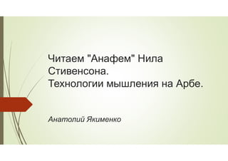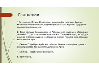Доклад посвящен анализу технологии мышления Нила Стивенсона с акцентом на систему создания и обращения знаний. Рассматриваются теоретические основы и исторические этапы развития различных орденов, связанных с мышлением и знанием. Включены схемы и модели, описывающие способы организации и создания знаний.