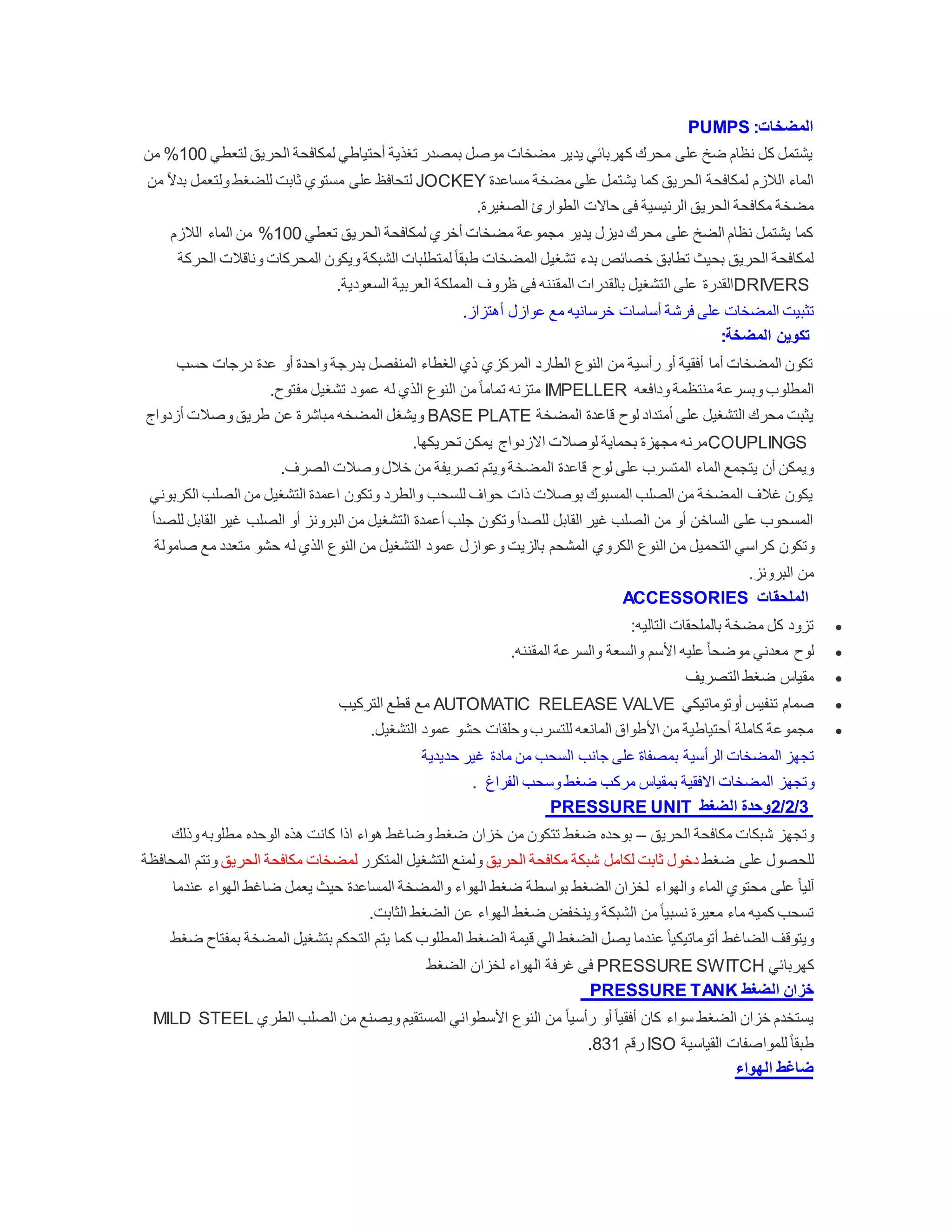 يتناول الوثيقة أنظمة مضخات مكافحة الحريق، موضحًا تكنولوجيا المضخات الكهربائية والديزل المستخدمة لضخ الماء بشكل فعال. كما يشمل تفاصيل حول تكوين المضخات الملحقات الضرورية لضمان الأداء السليم والمناسبه للوظائف المختلفة، بما في ذلك قياسات الضغط وصمامات الأمان. يستعرض أيضًا تفاصيل تركيب الوحدات المختلفة بما في ذلك خزانات الهواء والضواغط لضمان التشغيل اللازم.