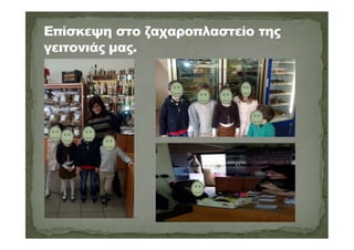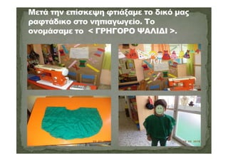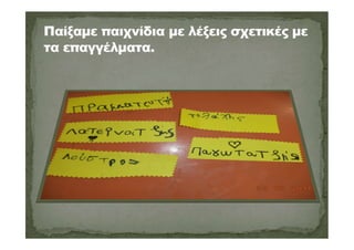 Μέσα από επισκέψεις που κάναμε, αλλά και επισκέψεις που δεχτήκαμε ήρθαμε σε επαφή με το επάγγελμα του αγγειοπλάστη, βαρελά, γεωργού, μοδίστρας, δασκάλας, υδραυλικού, μαραγκού, πυροσβέστη ,γυμνάστριας,ζωγράφου,ηθοποιού,συγγραφέα,παπά κλπ.