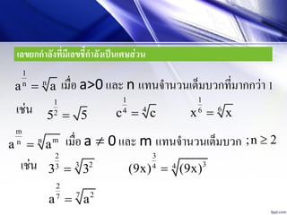a>0 และ n แทนจำนวนเต็มบวกที่มำกกว่ำ 1 เช่น 1 2 5 5 1 66 x x 1 44 c c m mnn a a เมื่อ a 0 และ m แทนจำนวนเต็มบวก ;n 2 เช่น 2 233 3 3 3 344 (9x) (9x) 2 277 a a