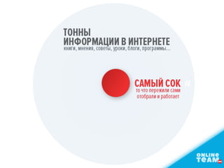 Документ описывает методики создания и управления онлайн-командой, включая стратегии привлечения и адаптации сотрудников, автоматизацию процессов и управление проектами. Автор делится своим опытом и достижениями в этой сфере, а также предлагает концепции и техники для эффективной работы в удаленном формате. Также упоминаются детали предстоящего воркшопа и возможности получения дополнительных знаний.