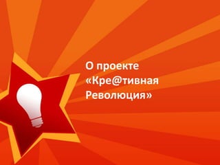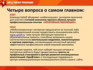 Проект «кре@тивная революция» инициирует обмен опытом между экспертами для развития универсальных компетенций, необходимых в новой мировой экономике. Участники могут предоставлять свои лучшие практики на сайте www.upself.ru и получать гранты на стажировки в центре «кре@тово». Проект ориентирован на подготовку креативно мыслящих специалистов и включает систему отбора материалов и участников через сетевой скрининг и экспертное голосование.