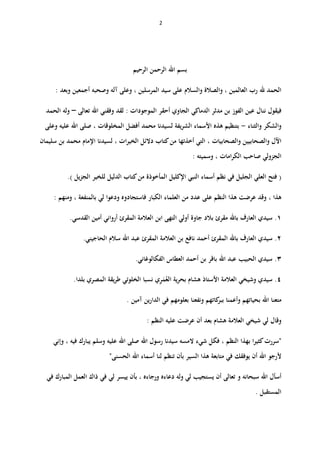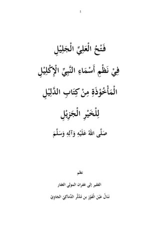 وبعد أجمعين وصحبو آلو وعلى , المرسلين سيد على والسالم والصالة , العالمين رب فيقولالدماكي مدثر بن الفوز عين ننالالجاويالموجودات أحقرتعالى الل وفقني لقد :–ولوالحمد والثناء والشكر-األسم ىذه بتنظيميرالش اءل فةوعلى عليو الل صلى , المخلوقات أفضل محمد سيدنا , والصحابيات والصحابيين اآللاْلمام لسيدنا , اترالخي دالئل كتابمن أخذتها التيسليمان بن محمد الجزاماترالك صاحب وليو ,: سميتو ال العلي فتح (نظم في جليلال أسماءنبياْلكليلالمأخوذ) يلزالج للخير الدليل كتابمن ة. ىذا,ف الكبار العلماء من عدد على النظم ىذا عرضت وقداستودع جادوهلي وابالمنفع: ومنهم , ة ٔ.سيديالعارفباللجاوة بالد مقرئالتهى أولياالمقرئ العالمة بنأرواأمين نيالقدسي. ٕ.سيديالعالمة بن نافع أحمد المقرئ بالل العارفسالم الل عبد المقرئ.الحاجيني ٖالحبيب سيدي .الفكالوغاني العطاس أحمد بن باقر الل عبد. ٗ.سيديوشيخيالعالمةاألستاذُالع يةربح ىشامَمِرييقةرط الخلوتي نسبا.بلدا المصري متعنابحيا اللوأعمن تهماونفعنا كاتهمببرب. آمين ينرالدا في علومهم وقالشيخي ليالعالمةىشام: النظم عليو عرضت أن بعد "سررت, النظم بهذا اركثي, فيو يبارك وسلم عليو الل صلى الل رسول سيدنا المسو شيء فكلوإني أليوفق أن الل رجومتابعة فيالحسنى الل أسماء لنا تنظم بأن السير ىذا" أسألاللو سبحانوتعالىيستجيب أنليولودعاءه, ورجاءهبأنلي ييسرال العمل ذاك فيفي مبارك المستقبل.