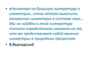 Документ исследует симметрии, асимметрии и антисимметрии в контексте природных процессов и знаний, подчёркивая сложности и динамику понимания симметрии в разных научных и философских традициях. Акцентируется внимание на роли симметрий в физике и их значении для формирования знаний о вселенной, а также на проблемах асимметрии в процессе познания. Рассматриваются различные аспекты симметрии, её применения и вызовы в рамках концепций, таких как лабиринт, фокусы знания и отношения между симметрией и асимметрией.