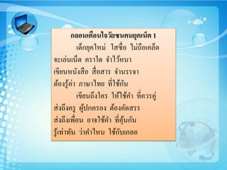 ไม่ถือเคล็ด จะเล่นเน็ต คราใด จาไว้หนา เขียนหนังสือ สื่อสาร จานรรจา ต้องรู้ค่า ภาษาไทย ที่ใช้กัน เขียนถึงใคร ให้ใช้คา ที่ควรคู่ ส่งถึงครู ผู้ปกครอง ต้องคัดสรร ส่งถึงเพื่อน อาจใช้คา ที่คุ้นกัน รู้เท่าทัน ว่าคาไหน ใช้กับเกลอ