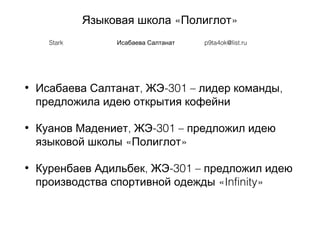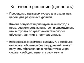 Документ описывает идеи и предложения для языковой школы «Полиглот», включая открытие кофейни и производство спортивной одежды. Основное внимание уделяется индивидуальным подходам в обучении языкам через креативные методы, занятия с носителями языка и гибкий график. Отличительные преимущества школы включают высококвалифицированный персонал, качественное преподавание и комфортную атмосферу.
