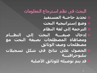 يتناول المستند استراتيجيات استرجاع المعلومات وتحديد حاجة المستفيدين، مع التركيز على معالجة البيانات وأنظمة البحث المختلفة. كما يسلط الضوء على تطور نظم الاسترجاع من النظم التقليدية إلى الحديثة، بما في ذلك استخدام الإنترنت. يناقش المستند أيضا التحديات المرتبطة بتعدد المصادر واللغات وتأثيرها على كفاءة البحث.