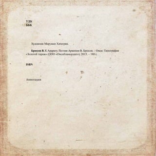 Документ представляет собой сборник армянской поэзии, составленный Валерием Брюсовым, в котором собраны лирические и эпические произведения, отражающие культуру и мифологию Армении. В тексте рассматриваются темы любви, природы и мифических персонажей, таких как царя Арташеса и божество Ваагн. Включены как древние песни, так и современные интерпретации, созданные для сохранения и популяризации армянской поэзии.