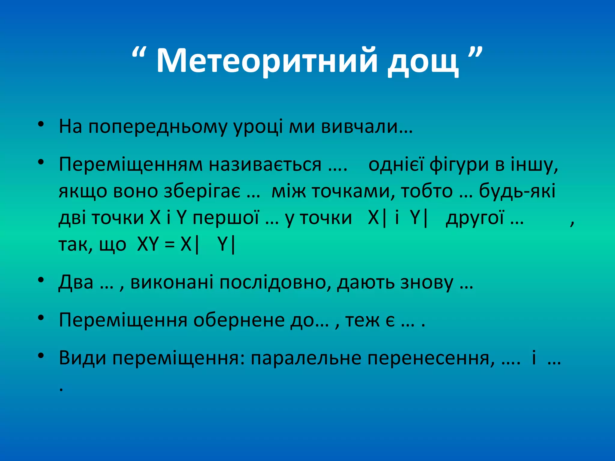 “ Метеоритний дощ” • На попередньому уроці ми вивчали… • Переміщенням називається …. однієї фігури в іншу, якщо воно зберігає … між точками, тобто … будь-які дві точки X і Y першої … у точки X| і Y| другої … , так, що XY = X| Y| • Два … , виконані послідовно, дають знову … • Переміщення обернене до… , теж є … . • Види переміщення: паралельне перенесення, …. і … .