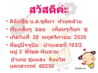 สวัสดีค่ะ ดิฉันชื่อ น. ส . ชุติมา ท้วมคล้าย เรียกสั้นๆ ออย เพื่อนๆเรียก ชุ เกิดวันที่ 20 พฤศจิกายน 2535 ที่อยู่ปัจจุบัน บ้านเลขที่ 103/2 หมู่ 3 ตำบล พันลาน อำเภอ ชุมแสง จังหวัด นครสวรรค์ 60250 - 3.