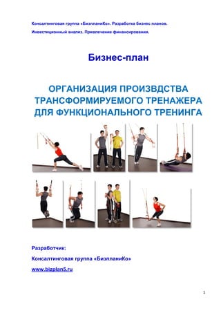 Документ представляет инвестиционный проект по организации производства уникального трансформируемого тренажера для функционального тренинга в Москве. Проект направлен на удовлетворение растущего спроса на спортивные товары на российском рынке и включает маркетинговый анализ, определение потребностей и конкурентных преимуществ. Ожидается положительный финансовый результат и выгодная динамика роста рынка спортивного оборудования.
