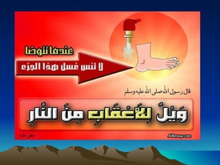 الوضوء هو استخدام الماء في أعضاء معينة بنية التطهر، وهو واجب قبل الصلاة والطواف ومس المصحف. يتطلب الوضوء نية في القلب، ويجب غسل الوجه واليدين والرجلين ومسح الرأس وأذنيه بالتتابع، مع شروط وضوئية محددة. فضائل الوضوء تمتد لتشمل تطهير النفس ومنع الأمراض، كما أظهرت دراسات أنه يقلل من انتشار حالات العمى في بعض البلدان.