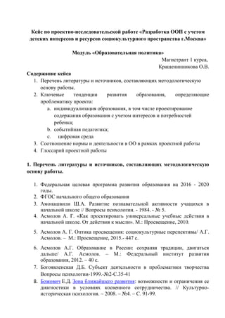 Документ представляет кейс проектно-исследовательской работы по разработке образовательного процесса с учетом детских интересов и социокультурного пространства Москвы. В нем рассматриваются ключевые тенденции в образовании, такие как индивидуализация, событийная педагогика и цифровая среда, подчеркивается важность формирования интересов детей через использование ресурсов города. Кроме того, акцентируется внимание на новой роли учителя как организатора образовательного пространства, в котором ребенок становится активным субъектом обучения.