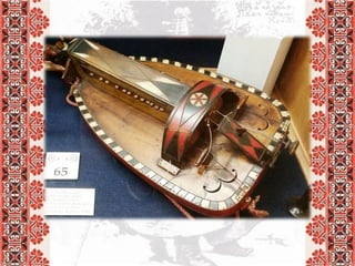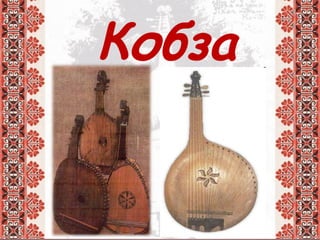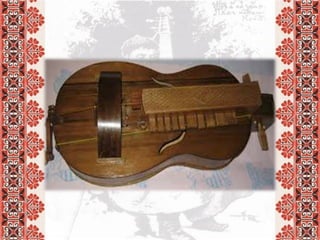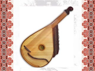 Документ описывает традиционные украинские музыкальные инструменты, такие как кобза, бандура, сопилка, колёсная лира и цимбалы, и их особенности. Каждый инструмент имеет уникальные характеристики, включая способ игры и используемые материалы. Кроме того, упоминаются оркестры народных инструментов и их отличие от камерных ансамблей.