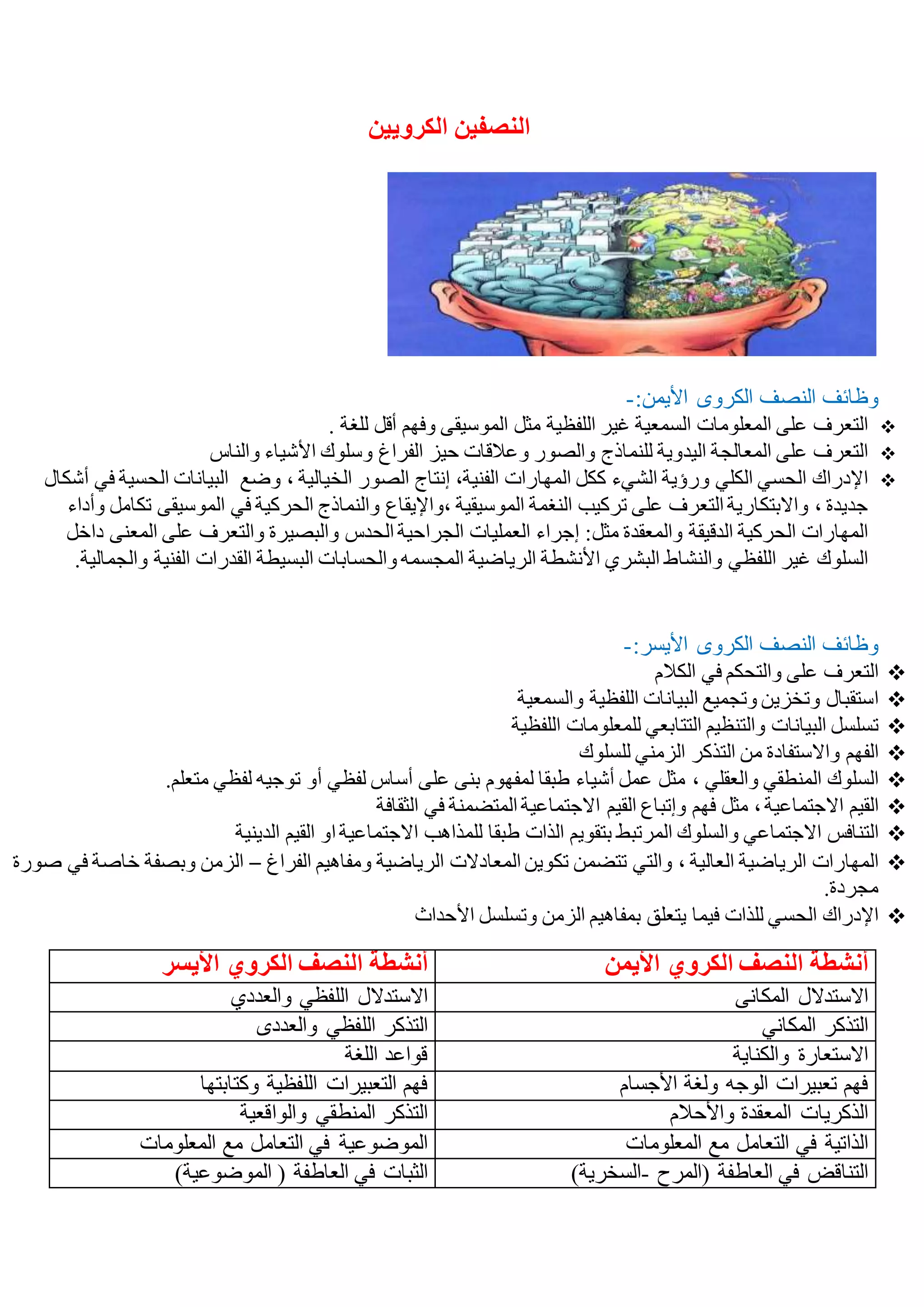 تناقش الوثيقة وظائف النصفين الكرويين للمخ، حيث يتميز النصف الأيمن بمعالجة المعلومات غير اللفظية والمهارات الحركية الإبداعية، بينما يختص النصف الأيسر بالكلام والبيانات اللفظية والتفكير المنطقي. يظهر ذلك من خلال تحليل المهارات العقلية والذهنية المرتبطة بكل نصف، مما يبرز الفروق النسبية في الأداء وأنماط التعلم. يتم التأكيد على أن الوظائف ليست حصرية لكل نصف، بل تتفاعل وتكامل بشكل معقد.