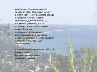 Абхазия - живописный регион на побережье Черного моря с субтропической растительностью, известный своими курортами и историческими достопримечательностями. Главные города, такие как Сухуми, Пицунда и Гагра, предлагают разнообразные пляжи и культурные объекты, включая заповедники и исторические храмы. Туристы могут насладиться уникальными природными ландшафтами и различными удобствами для отдыха, подходящими для всех возрастов.