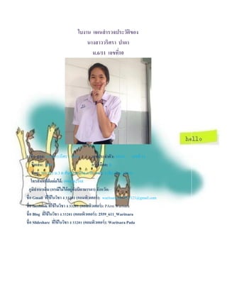 เลขที่10 1. ชื่อ-สกุล: นางสาววริศรา ปาดา เลขประจาตัว: 44643 เลขที่ 10 ชื่อเล่น: ป่าน กรุ๊ปเลือด: B ที่อยู่: 501/121 ม.3 ต.สันทรายน้อย อ.สันทราย จ.เชียงใหม่ 50210 โทรศัพท์ที่ติดต่อได้: 0946362168 ภูมิลาเนาเดิม (กรณีไม่ได้อยู่กับบิดามารดา) จังหวัด: - ชื่อ Gmail ที่ใช้ในวิชา ง 33201 (คอมพิวเตอร์): waritsara3412312121@gmail.com ชื่อ facebook ที่ใช้ในวิชา ง 33201 (คอมพิวเตอร์): PArm Warisara ชื่อ Blog ที่ใช้ในวิชา ง 33201 (คอมพิวเตอร์): 2559_611_Waritsara ชื่อ Slideshare ที่ใช้ในวิชา ง 33201 (คอมพิวเตอร์): Waritsara Pada