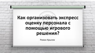 Документ обсуждает возможности и механики экспресс-оценки персонала с использованием деловых игр, разработанных Романом Крыловым, который имеет значительный опыт в этой области. Преимущества и недостатки такого подхода включают возможность оценки большого числа сотрудников одновременно и подробное представление о реальных компетенциях участников. Также рассматривается типология игроков по Бартлу и методы оценки разных компетенций в процессе игры.