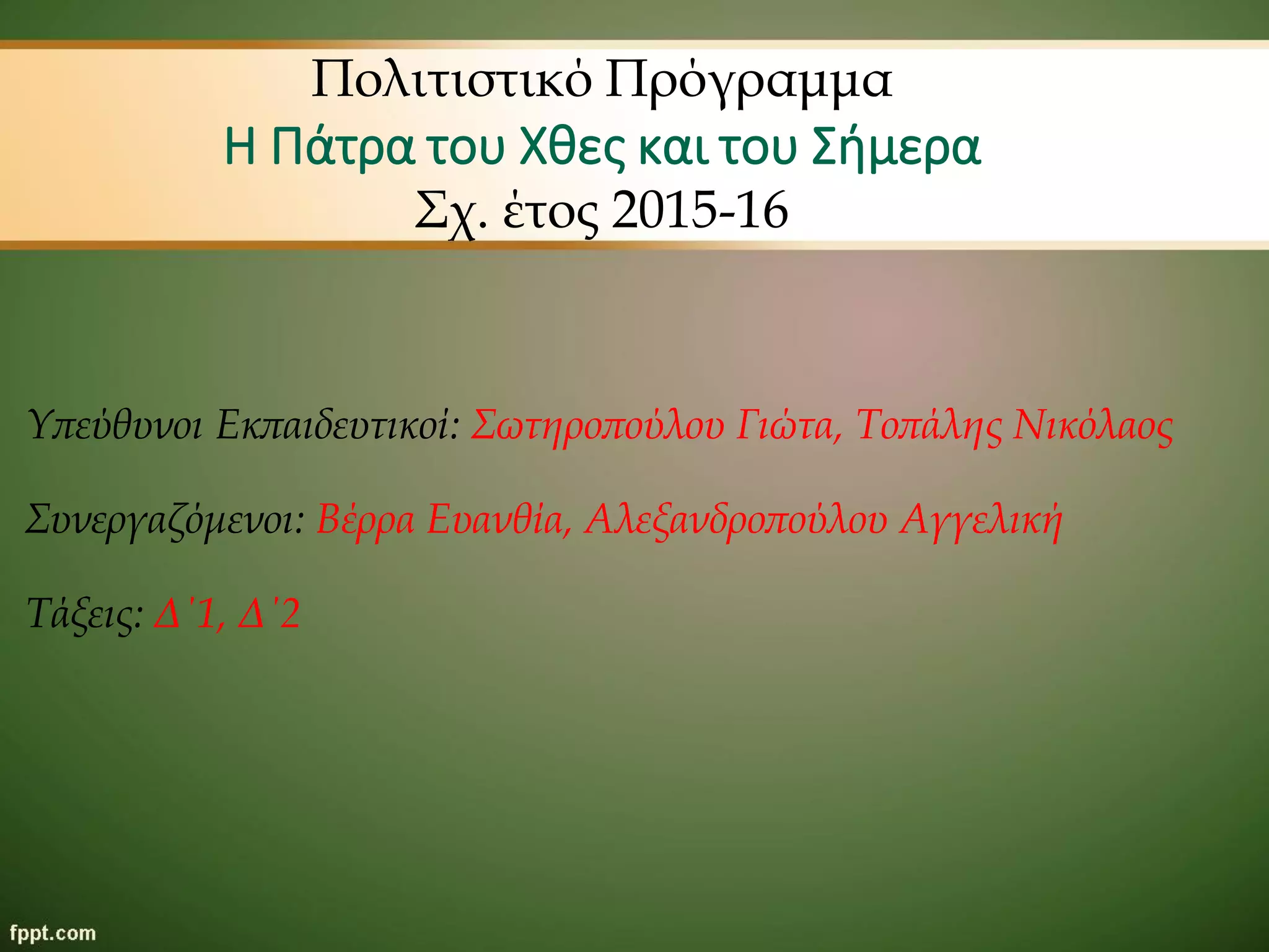 Οδηγοί μας σε αυτό το ταξίδι είναι οι δάσκαλοι των παιδιών της Δ' τάξης κα Γιώτα Σωτηροπούλου και κος Νίκος Τοπάλης, η δασκάλα της μουσικής κα Εύη Βέρρα που μας ταξίδεψε μουσικά σε όμορφες μελωδίες Πατρινών δημιουργών και τέλος στη δασκάλα της πληροφορικής μας κα Αγγελική Αλεξανδροπούλου.