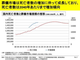 No.2 葬儀市場は死亡者数の増加に伴って成長しており、 死亡者数は2040年あたりまで増加傾向 資料:平成26年(2014)人口動態統計の年間推計、厚生労働省 特定サービス産業動態統計調査、経済産業省 日本の将来推計人口(平成24年1月推計)、国立社会保障・人口問題研究所 国内死亡者数と葬儀市場規模の推移(1980-2060年、人、億円) 0 5000 10000 15000 20000 0 200,000 400,000 600,000 800,000 1,000,000 1,200,000 1,400,000 1,600,000 1,800,000 80 84