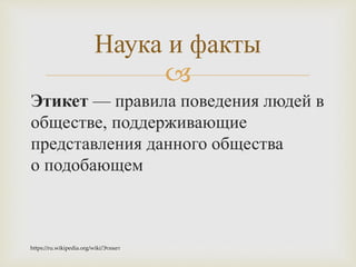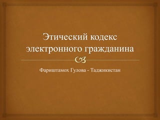 Документ обсуждает правила сетевого этикета и этического кодекса электронного гражданина, которые необходимы для комфортного общения в интернете и соблюдения норм поведения. В нем подчеркиваются важность уважения прав и свобод человека, соблюдения норм государственного языка, а также недопустимость распространения порнографических материалов и дискриминации. Документ также акцентирует внимание на ответственности пользователей за распространяемую информацию и соблюдение этики в виртуальном пространстве.