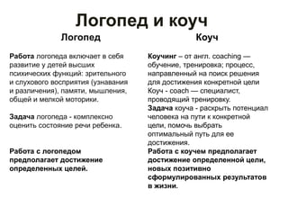 Документ описывает применение коучингового подхода в работе логопеда, включая различия между классическим и коучинговым форматами занятий. Важно участие родителей в процессе, что способствует более эффективной работе с детьми и достижению поставленных целей. Примеры из практики показывают, что коучинговый подход позволяет быстрее достигать результатов и поддерживает мотивацию как у детей, так и у родителей.
