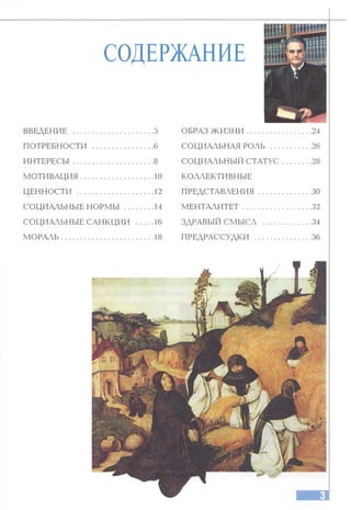Документ анализирует роль человека в обществе, рассматривая его потребности, мотивацию и социальные нормы. Освещаются различные аспекты жизни, включая семью, образование, профессию и здоровье, а также влияние культуры на поведение и ценности индивидов. Подчеркивается, как интересы и потребности формируют общественные отношения и личностное развитие.