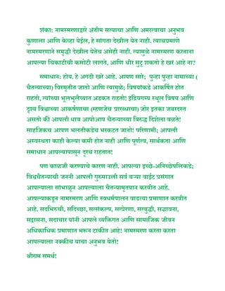 पण काळजी करण्याचे कारण नाही. आपल्या इच्छे-अनिच्छेपलिकडे; विश्वचैतन्याची जननी आपली गुरुमाउली सर्व बऱ्या वाईट प्रसंगात आपल्याला सांभाळून आपल्याला चैतन्यामृतपान करवीत आहे. आपल्याकडून नामस्मरण आणि स्वधर्मपालन वाढत्या प्रमाणात करवीत आहे. सदभिरुची, सदिच्छा, सत्संकल्प, सत्प्रेरणा, सत्बुद्धी, सद्भावना, सद्वासना, सदाचार यांनी आपले व्यक्तिगत आणि सामाजिक जीवन अधिकाधिक प्रमाणात भरून टाकीत आहे! नामस्मरण करता करता आपल्याला नक्कीच याचा अनुभव येतो!