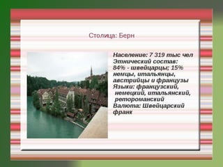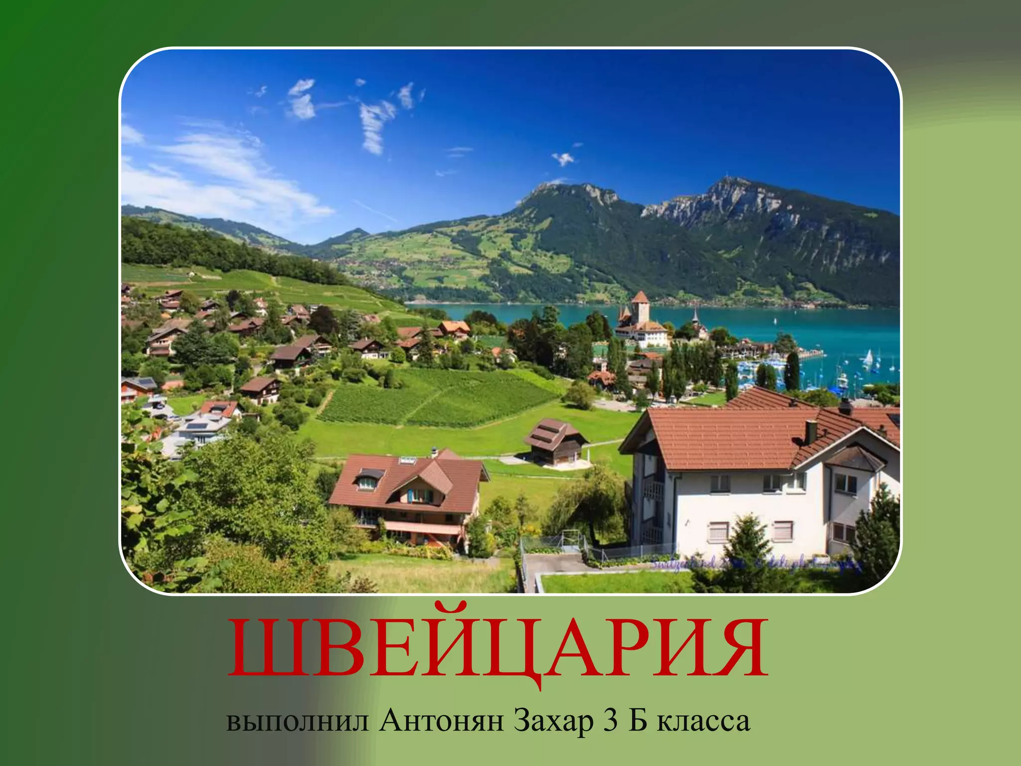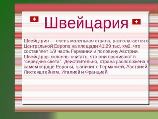 Швейцария — страна в центре Европы, известная своей красивой природой и горами, включая юру, центральное плато и Альпы. Она также знаменита высококачественными швейцарскими часами и шоколадом, который является важной частью культуры. В стране находятся бурные реки и чистые озера, а также самая высокая железная дорога и вокзал в долине юнгфрау.