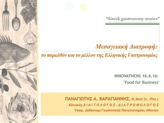 «Μεσογειακή Διατροφή, το παρελθόν και το μέλλον της Ελληνικής Γαστρονομίας» του Παναγιώτη Α. Βαραγιάννη M.Med.Sc., Κλινικού Διαιτολόγου – Διατροφολόγου, Υπ. Διδάκτωρ Γεωπονικού Πανεπιστημίου Αθηνών.