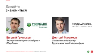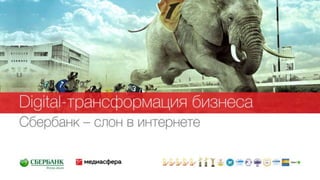 Документ касается digital-трансформации бизнеса Сбербанка и развития его интернет-эквайринга, а также онлайн-сервисов для физических и юридических лиц. Обсуждаются преимущества интернет-эквайринга, рост числа внедрений и активных пользователей, а также детали интеграции и возможности подключения для клиентов. Документ также включает информацию о новых IT-платформах, статистику по эквайрингу и различные аспекты работы с электронной документацией.