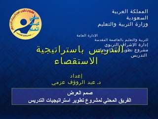 تتناول الوثيقة مشروع تطوير استراتيجيات التدريس في المملكة العربية السعودية، ويركز على التدريب على التدريس باستراتيجية الاستقصاء. يتضمن البرنامج أهدافا تفصيلية تهدف إلى تأهيل المتدربين لتطبيق هذه الاستراتيجية عبر عدة أنماط، مثل الاستقصاء الموجه والاستقصاء الحر. الوثيقة تقدم أيضاً أنشطة عملية لدعم تعلم المتدربين حول مكونات وخصائص وأساليب التدريس بالاستقصاء.