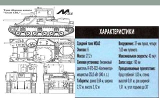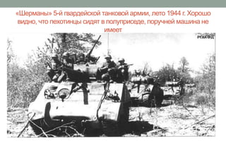 Документ описывает танки, используемые в Беларуси во время Второй мировой войны, в частности, «шерман», «валентайн» и «генерал стюарт». Основное внимание уделяется характеристикам этих танков, их экипажам и боевым использованию, включая операции 5-й гвардейской танковой армии и 3-го белорусского фронта. Автор подчеркивает преимущества и недостатки различных моделей, сравнивая их в контексте войны.