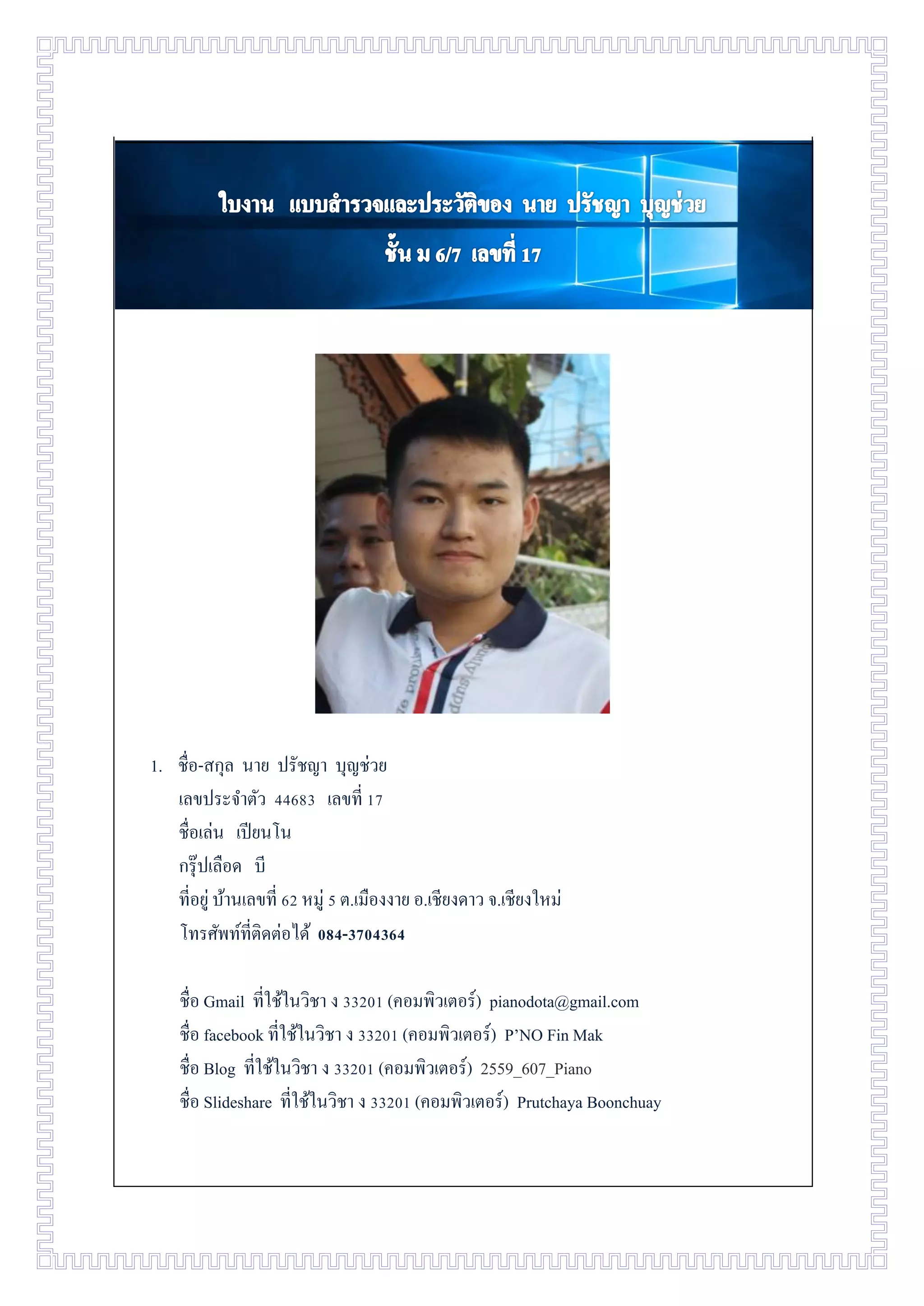 ปรัชญา บุญช่วย เลขประจาตัว 44683 เลขที่ 17 ชื่อเล่น เปียนโน กรุ๊ปเลือด บี ที่อยู่ บ้านเลขที่ 62 หมู่ 5 ต.เมืองงาย อ.เชียงดาว จ.เชียงใหม่ โทรศัพท์ที่ติดต่อได้ 084-3704364 ชื่อ Gmail ที่ใช้ในวิชา ง 33201 (คอมพิวเตอร์) pianodota@gmail.com ชื่อ facebook ที่ใช้ในวิชา ง 33201 (คอมพิวเตอร์) P’NO Fin Mak ชื่อ Blog ที่ใช้ในวิชา ง 33201 (คอมพิวเตอร์) 2559_607_Piano ชื่อ Slideshare ที่ใช้ในวิชา ง 33201 (คอมพิวเตอร์) Prutchaya Boonchuay