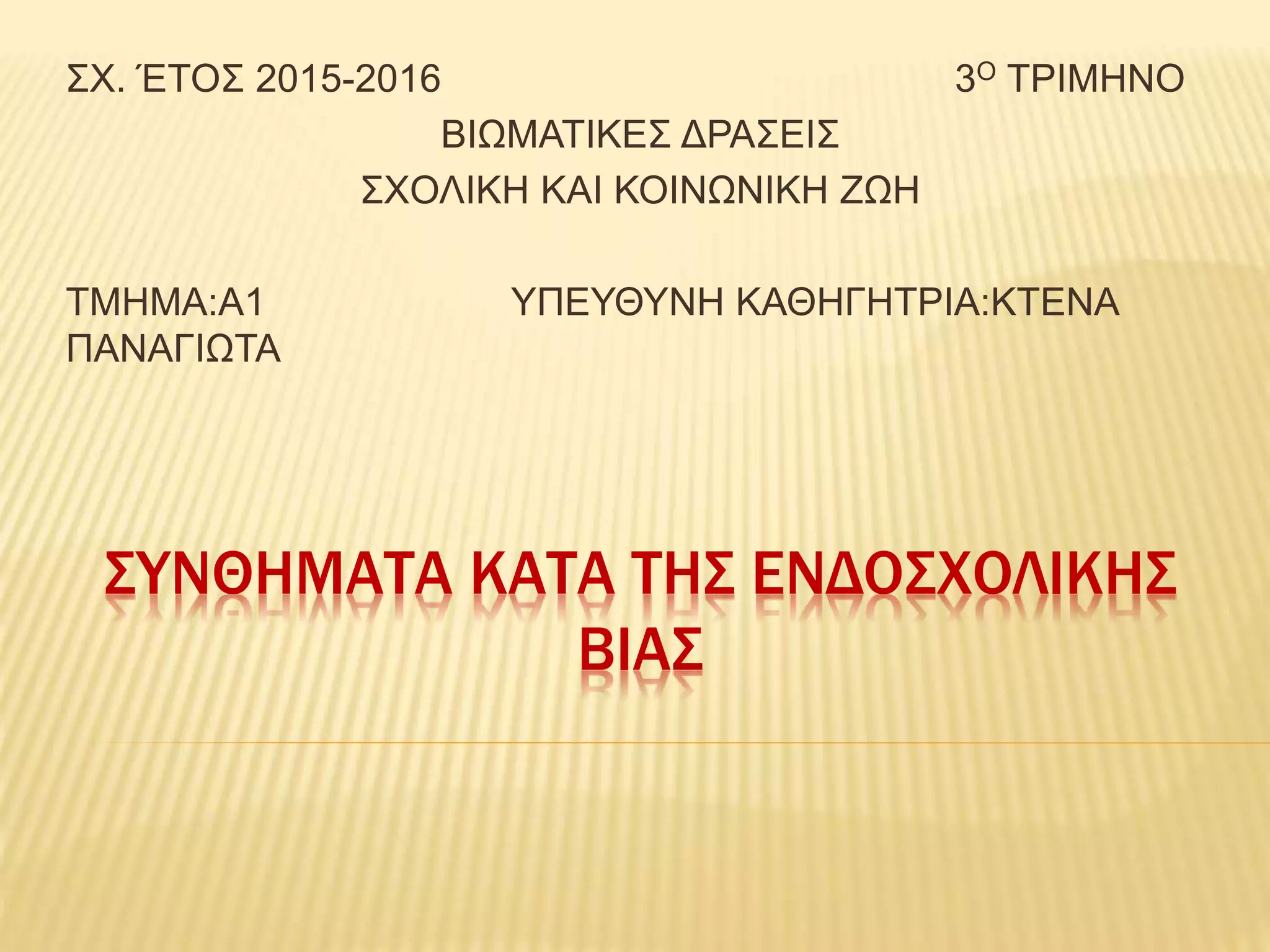 ΕΝΔΟΣΧΟΛΙΚΗΣ ΒΙΑΣ ΣΧ. ΈΤΟΣ 2015-2016 3Ο ΤΡΙΜΗΝΟ ΒΙΩΜΑΤΙΚΕΣ ΔΡΑΣΕΙΣ ΣΧΟΛΙΚΗ ΚΑΙ ΚΟΙΝΩΝΙΚΗ ΖΩΗ ΤΜΗΜΑ:Α1 ΥΠΕΥΘΥΝΗ ΚΑΘΗΓΗΤΡΙΑ:ΚΤΕΝΑ ΠΑΝΑΓΙΩΤΑ