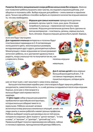 Документ описывает важность игрушек в жизни детей и их роль в развитии. Он рассказывает о различных типах игрушек, подходящих для каждого возраста, и подчеркивает значение игр для эмоционального и социального развития ребенка. Также даются советы родителям по выбору игрушек и организации игрового пространства для детей.