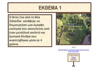 από τη Νέα Ζηλανδία κατάφερε να δημιουργήσει μια όμορφη εκκλησία που αποτελείται από έναν μεταλλικό σκελετό και ζωντανά δένδρα που αναπτύχθηκαν μέσα σε 4 χρόνια. ΕΠΙΣΤΡΟΦΗ ΣΤΗΝ ΕΚΘΕΣΗ ΕΚΘΕΜΑ 1