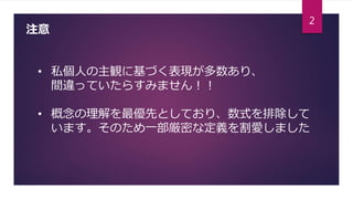 注意 • 私個人の主観に基づく表現が多数あり、 間違っていたらすみません!! • 概念の理解を最優先としており、数式を排除して います。そのため一部厳密な定義を割愛しました 2