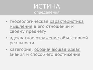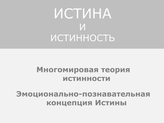 Документ обсуждает многомировую теорию истинности, выделяя различные подходы к пониманию истины, такие как корреспондентская, авторитарная и прагматическая. Он утверждает, что истинность предложений определяется их принадлежностью к конкретным логическим мирам и что истина не является статичным понятием, а представляет собой процесс, связанный с индивидуальным пониманием и восприятием. В заключение подчеркивается, что истина — это эмоциональное состояние, возникающее в процессе познания.
