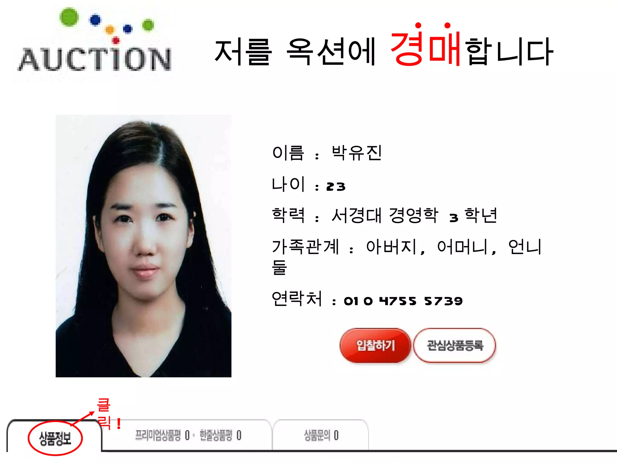 이름 : 박유진 나이 : 23 학력 : 서경대 경영학 3 학년 가족관계 : 아버지 , 어머니 , 언니 둘 연락처 : 010 4755 5739 저를 옥션에 경매 합니다 클릭 !