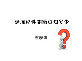 小總結 • 類風溼性關節炎是全身性的疾病 • 診斷方式有新的改變 •