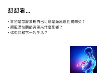 想想看… • 當初是怎麼發現自己可能是類風溼性關節炎? • 類風溼性關節炎帶來什麼影響? •
