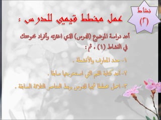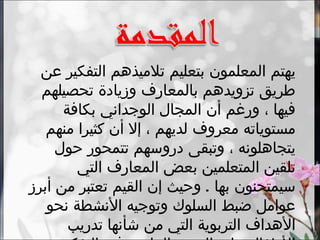 يؤكد المستند على أهمية تدريس القيم في المدارس كشرط أساسي لبناء شخصية الطفل، حيث أن القيم توجه سلوكيات الأفراد وتساعد في تحقيق الأهداف التربوية. يشير إلى دور المعلم في تعزيز هذه القيم من خلال حرية التفكير والإبداع، ويستعرض الشروط الضرورية لتدريس القيم بشكل فعال. كما يتضمن المستند استراتيجيات لتعليم القيم بشكل تدريجي ولربطها ببيئة الطلاب واحتياجاتهم.