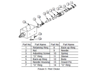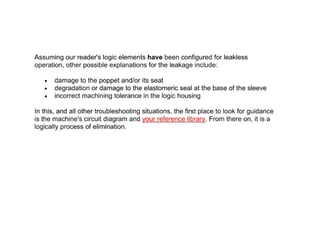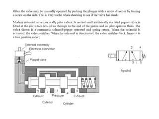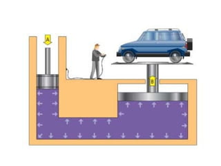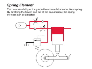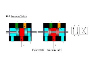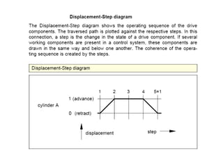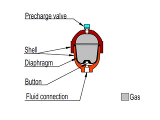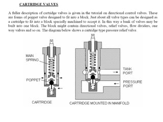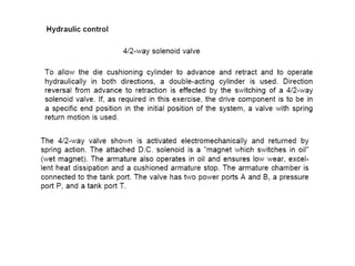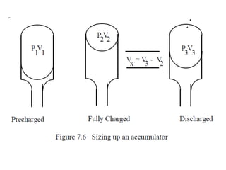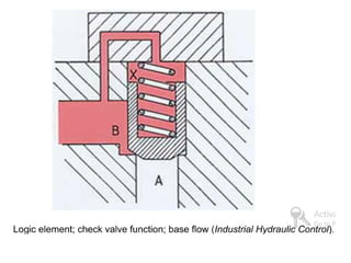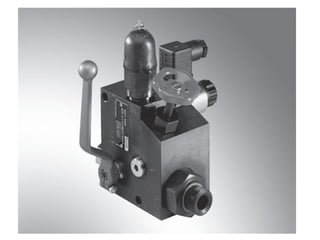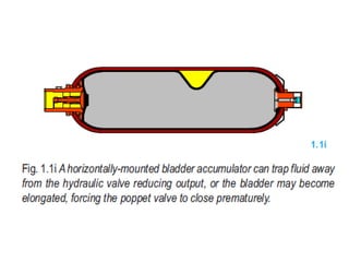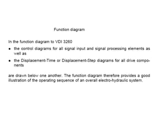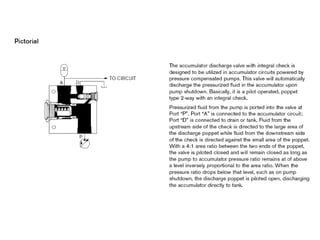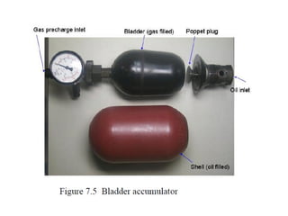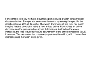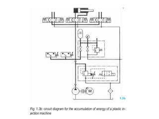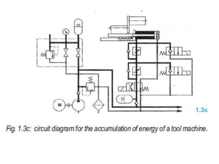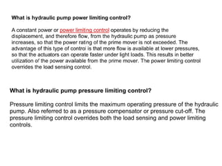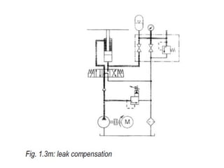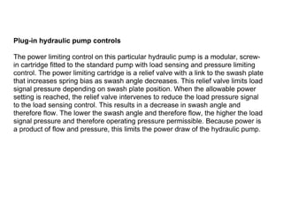 The document provides detailed information on hydraulic systems, focusing on principles such as hydraulic power, types of pumps including positive displacement and dynamic pumps, and key calculations for performance and energy efficiency. It explains concepts like potential and kinetic energy, Pascal's law, and specifics about different pump operations like gear and vane pumps. Additionally, it covers components of hydraulic circuits, including valves, pressure sensors, and system design considerations.