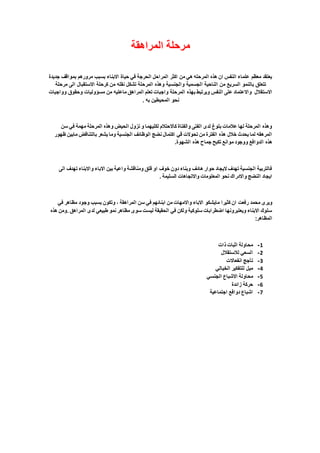 تتناول الوثيقة مرحلة المراهقة كمرحلة حيوية في حياة الأفراد تتسم بالتغيرات الجسدية والنفسية، حيث يتعلم المراهقون مسؤولياتهم وواجباتهم. التركيز على أهمية الحوار البناء بين الآباء والأبناء لمساعدة المراهقين في معالجة القلق والخوف المرتبط بتغيراتهم الجنسية. كما تشير الوثيقة إلى مظاهر سلوكية مختلفة تصاحب هذه المرحلة.