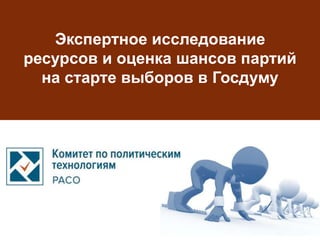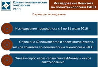 В исследовании, проведенном с 6 по 11 июля 2016 года, оценивались шансы партий на выборах в Госдуму, с опросом 60 политологов и политконсультантов. Основные выводы включают сильные позиции "Единой России", стабильные результаты ЛДПР и КПРФ, а также нечеткие перспективы для "Справедливой России" и других мелких партий. Оценки эффективности партийных ресурсов и предвыборных кампаний показали, что идеологические и технологические ресурсы являются ключевыми факторами успеха.