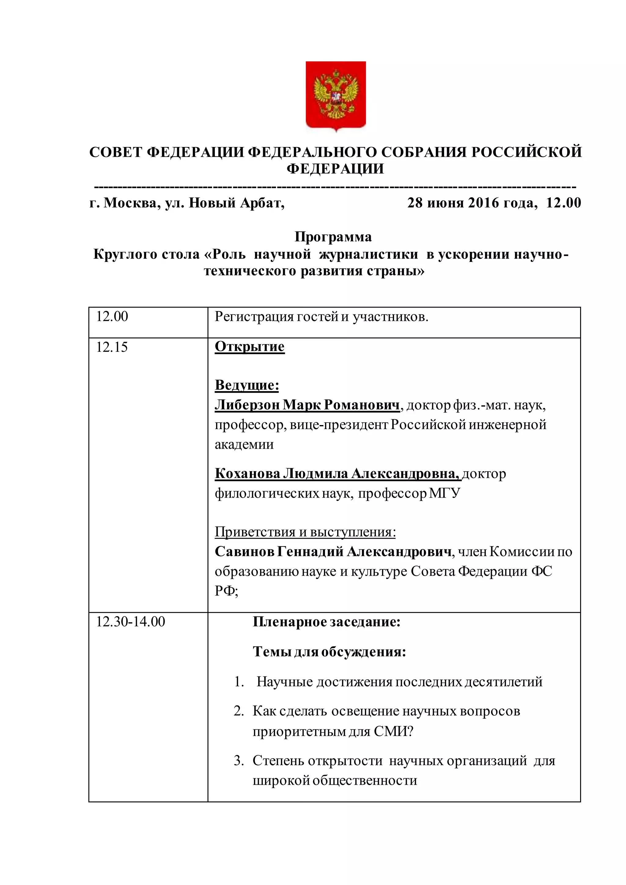 Документ представляет программу круглого стола на тему 'Роль научной журналистики в ускорении научно-технического развития страны', состоявшегося 28 июня 2016 года в Москве. В программе мероприятия регистрации участников, приветственные речи, пленарные заседания с обсуждением научных достижений и популяризации науки. Участники также обсудят открытость научных организаций и подготовку кадров в высшей школе.
